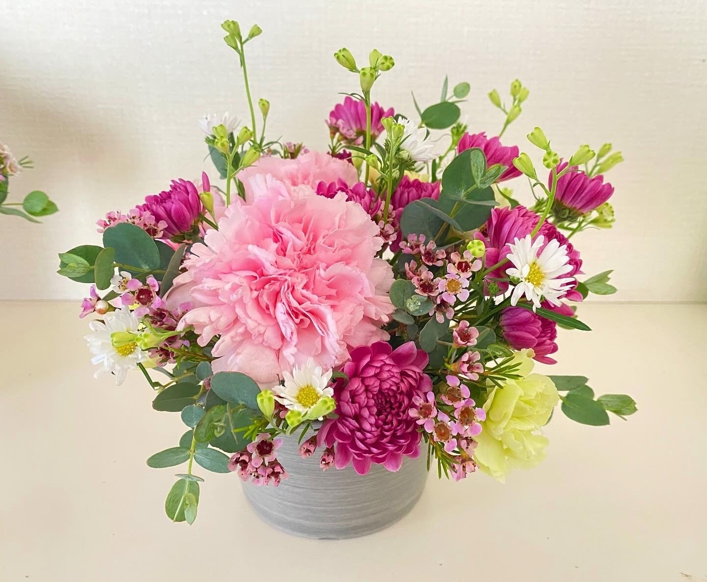 やわらかな色と、やさしい空気をまとった生花のアレンジメント。